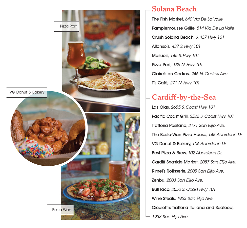 Pamplemousse Grille, scenic Pacific Coast Grill, and the always buzzing local hotpots Union Kitchen & Tap and Solace & The Moonlight Lounge, to San Elijo State Beach campground’s cult favorite, Bull Taco, Hawaiian-inspired The Lanai in Leucadia, and the ever-popular (for very good reason) VG Donut & Bakery, arguably the best place to satisfy your sweet tooth with sand still between your toes.